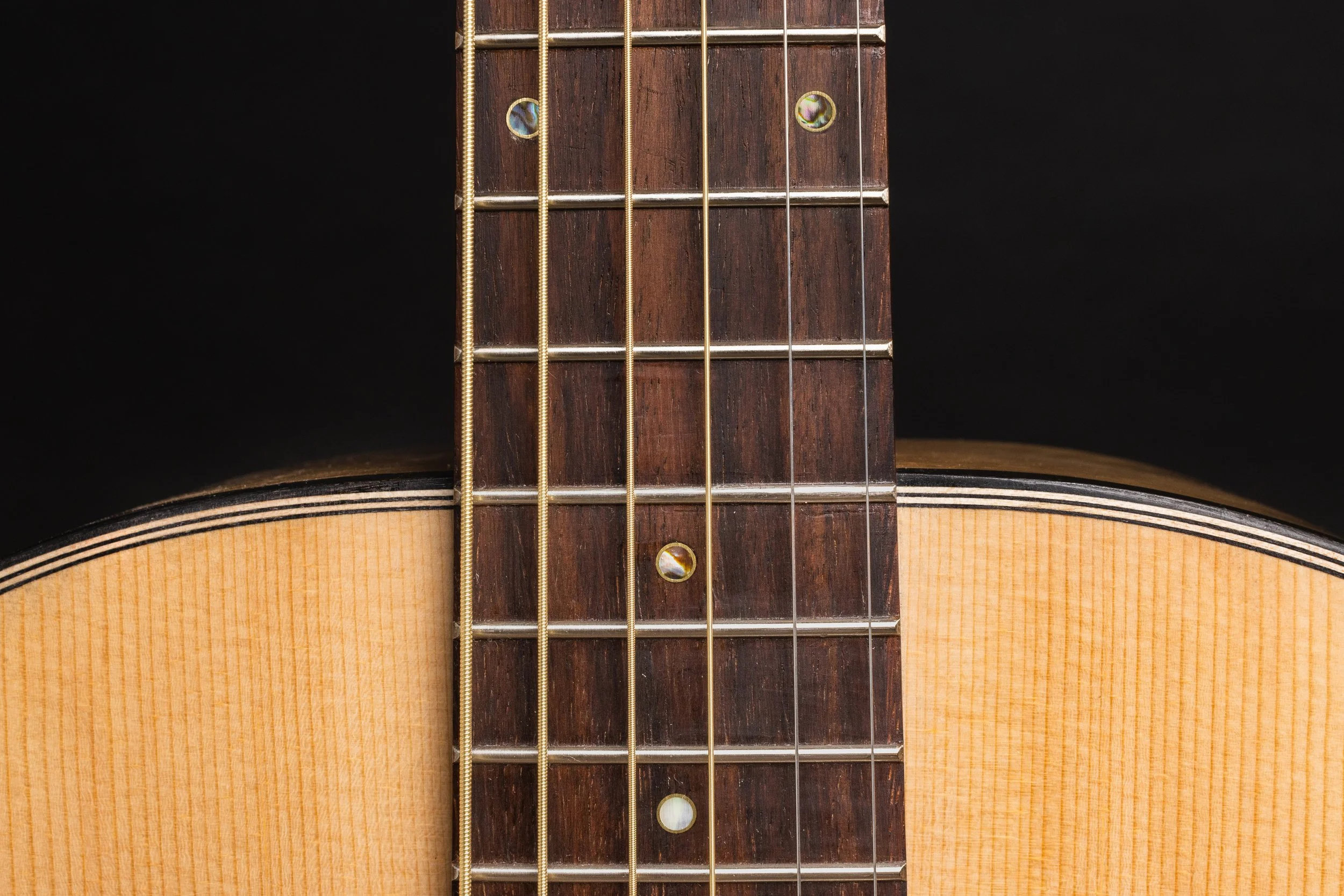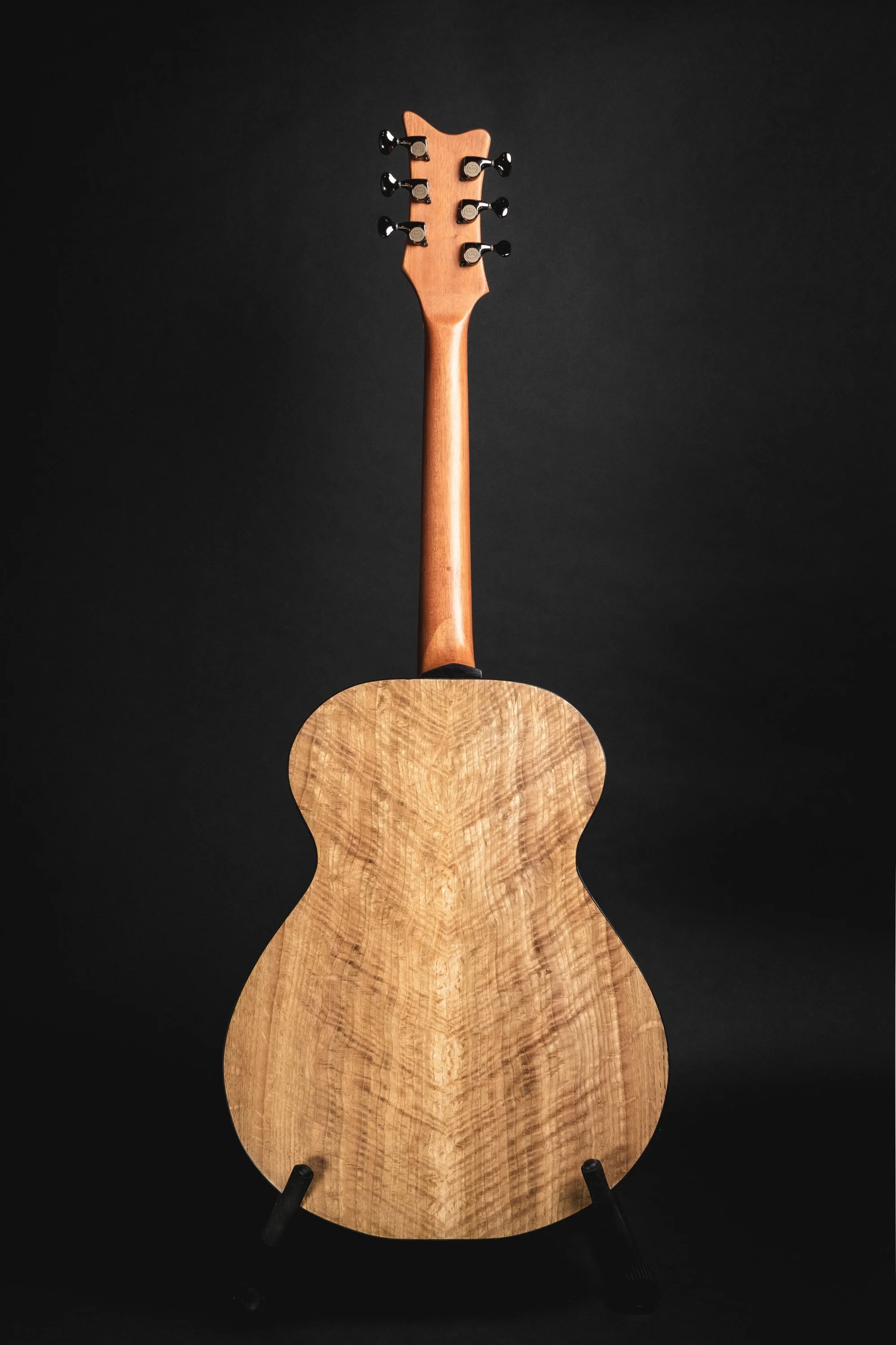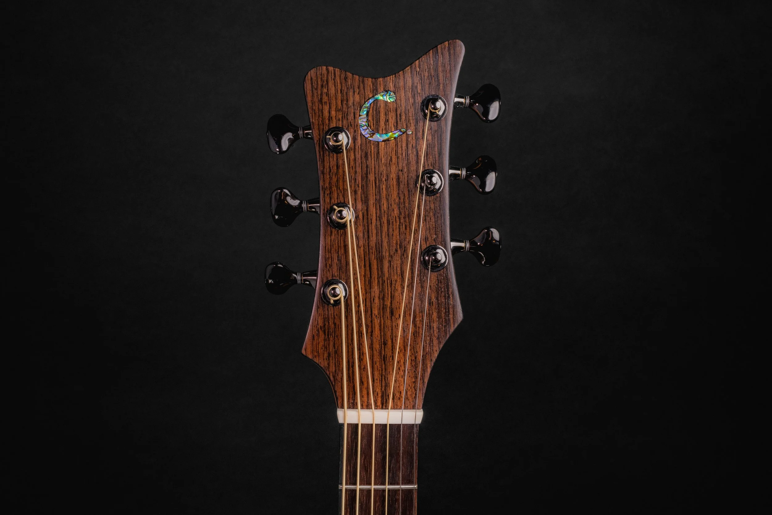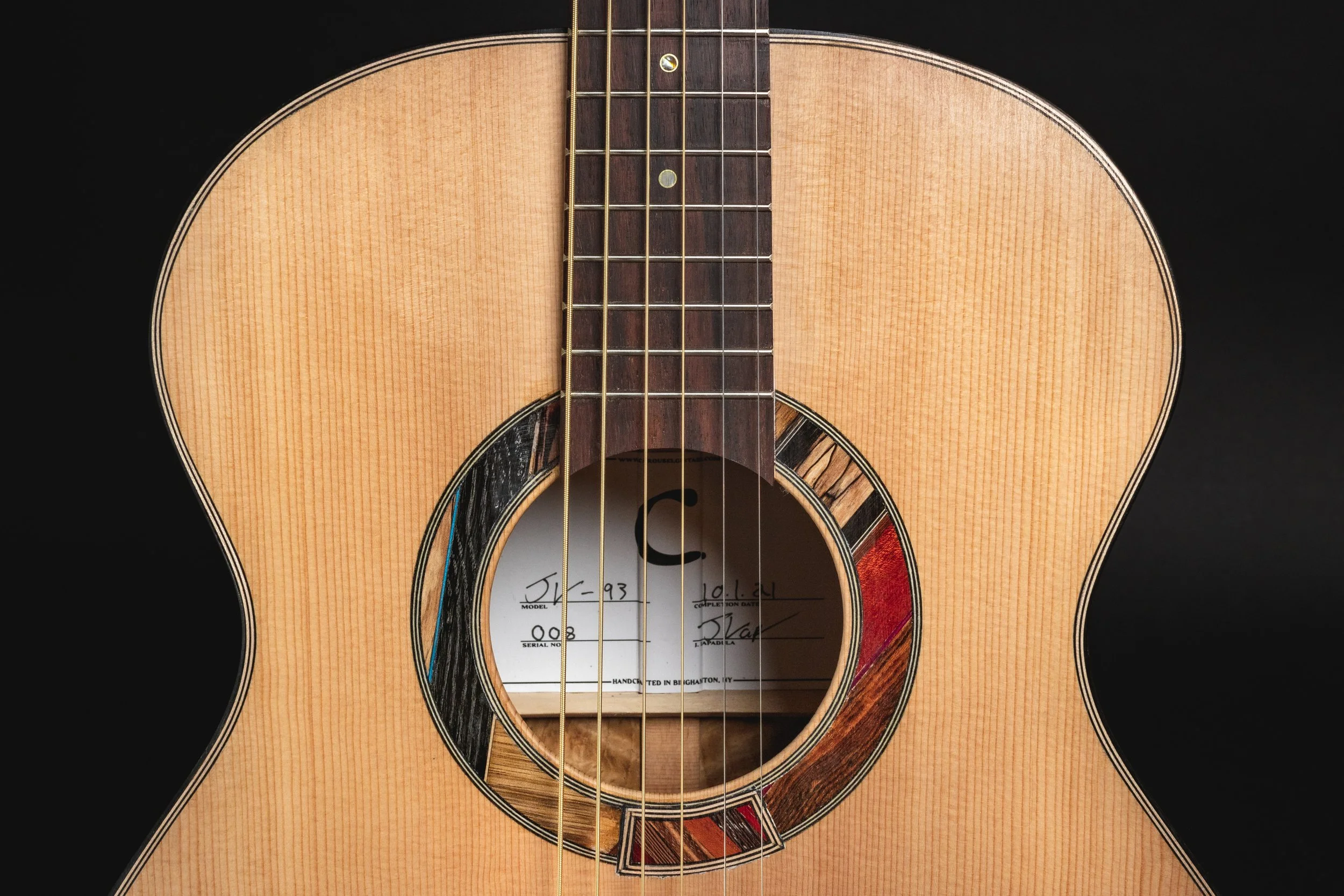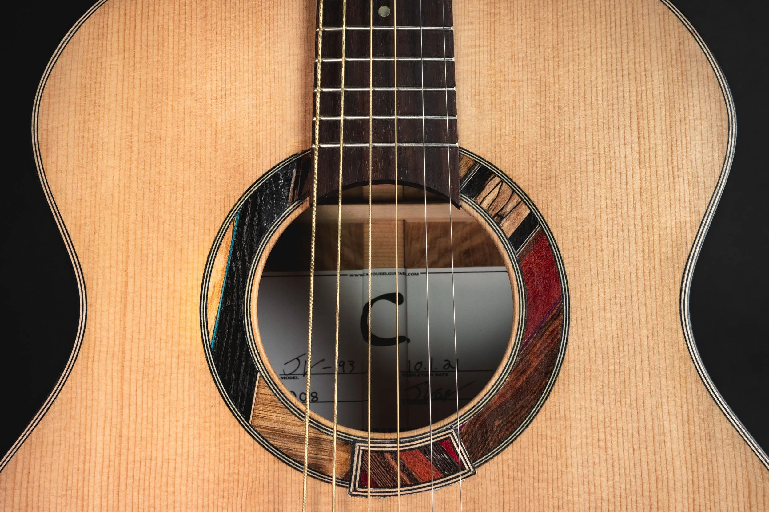 This instrument contains many “firsts.” I had never built with mahogany, used black tuners, or built a mixed-media rosette in this way. This guitar is the heaviest of the batch and sounded like a cannon. It was the favorite of several players, much to the amusement of the buyer!