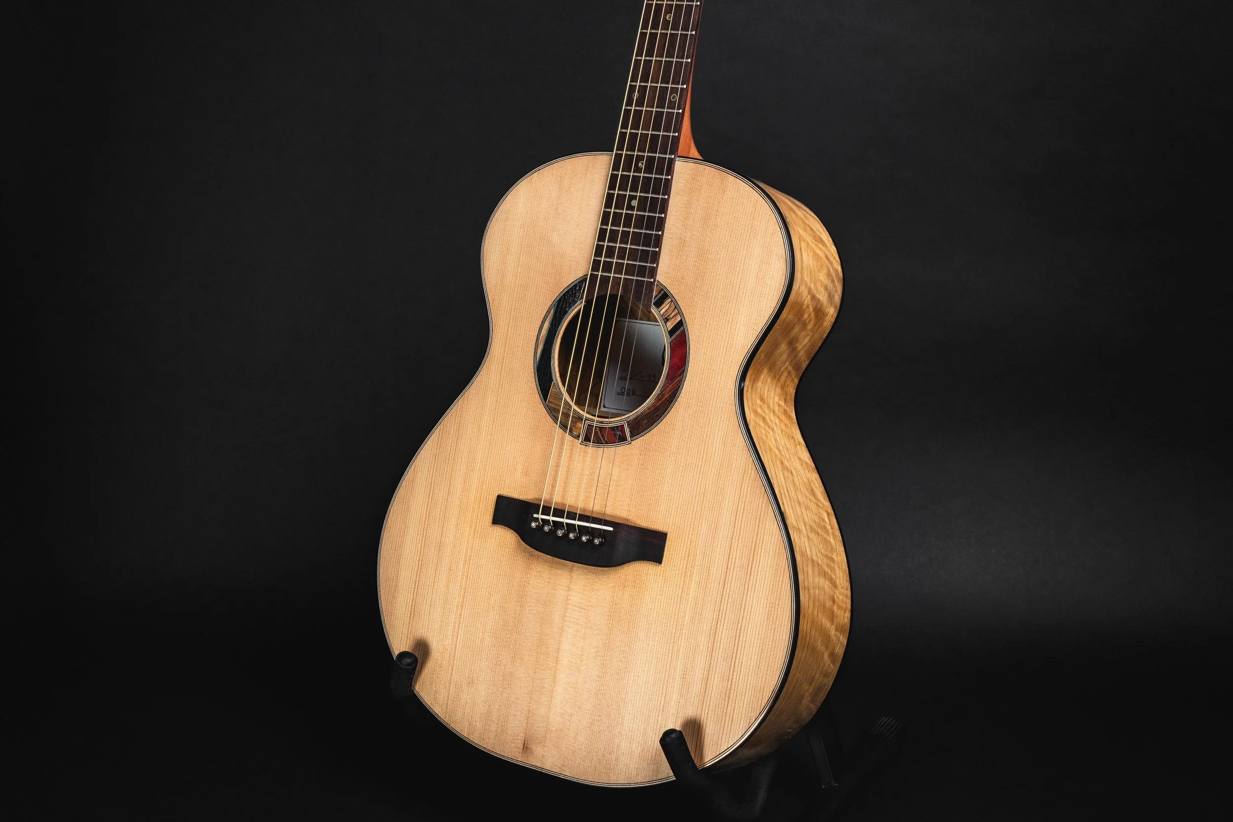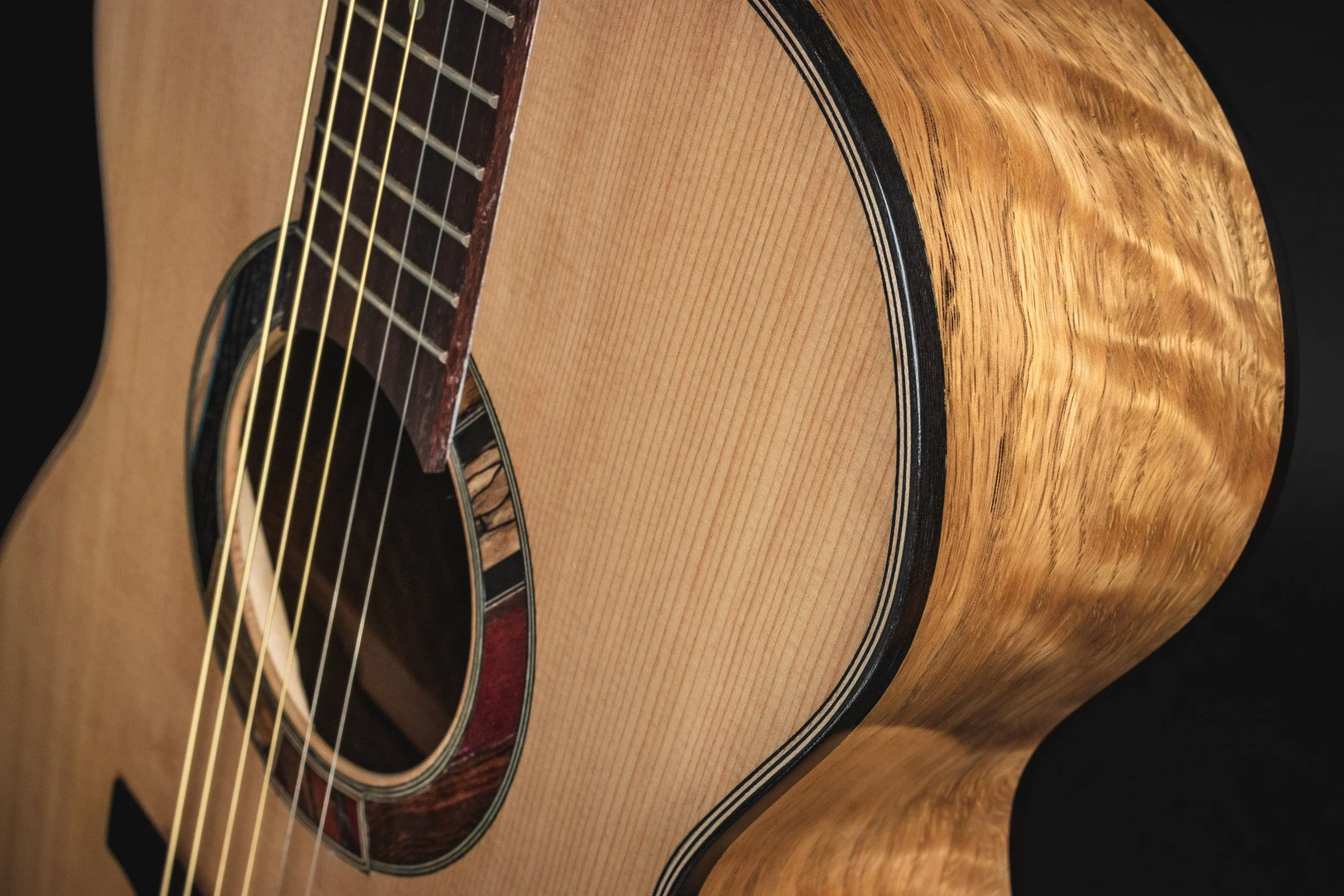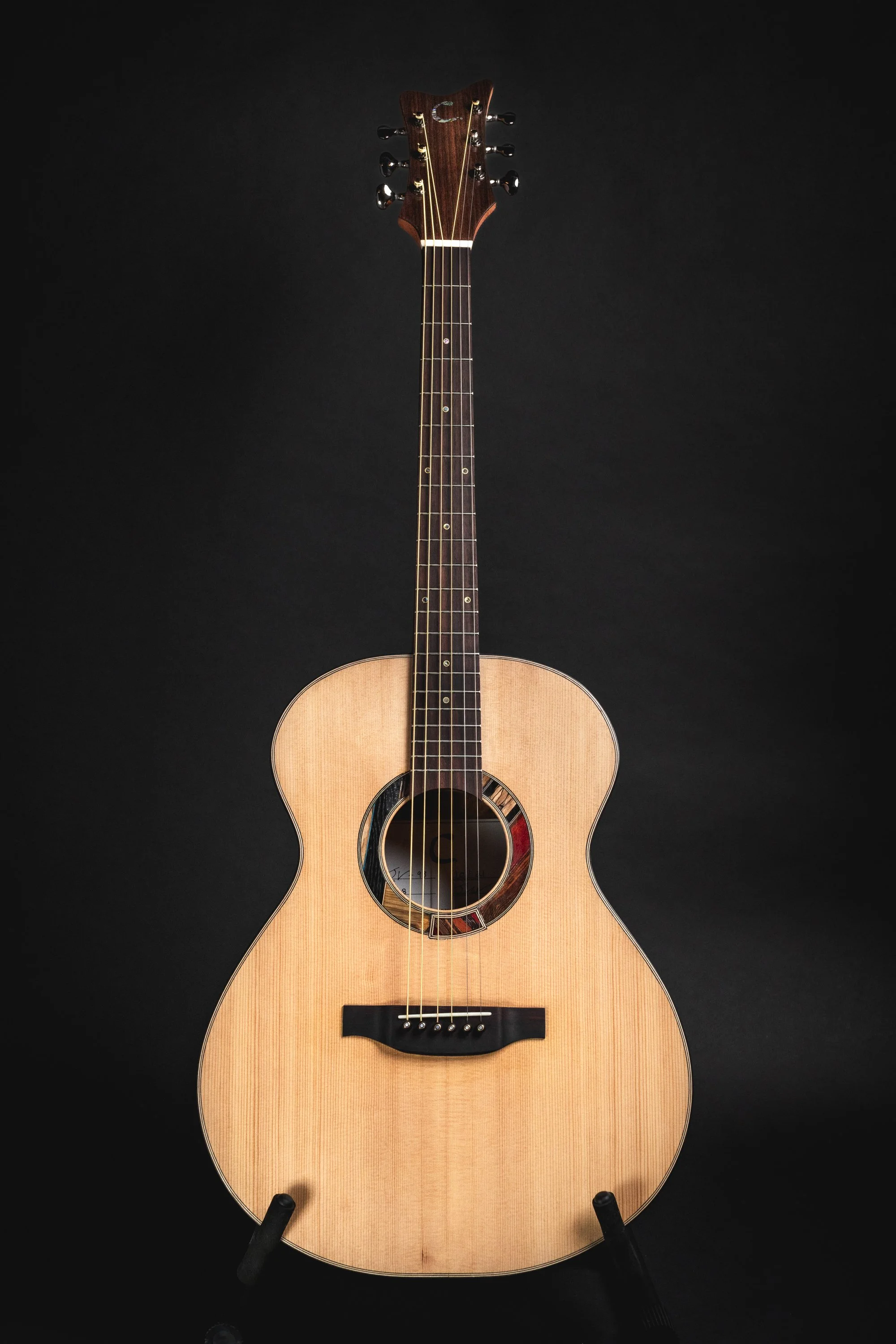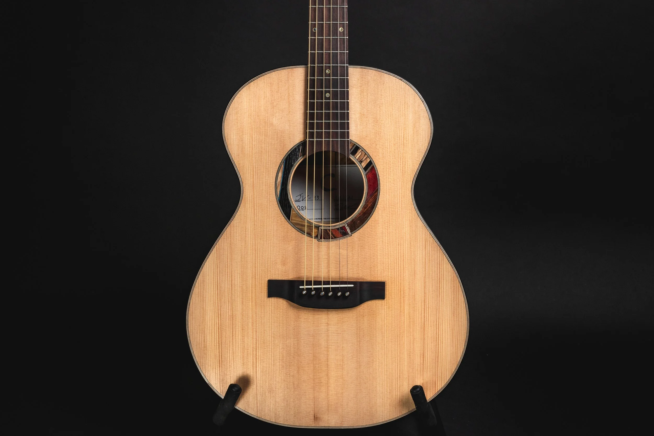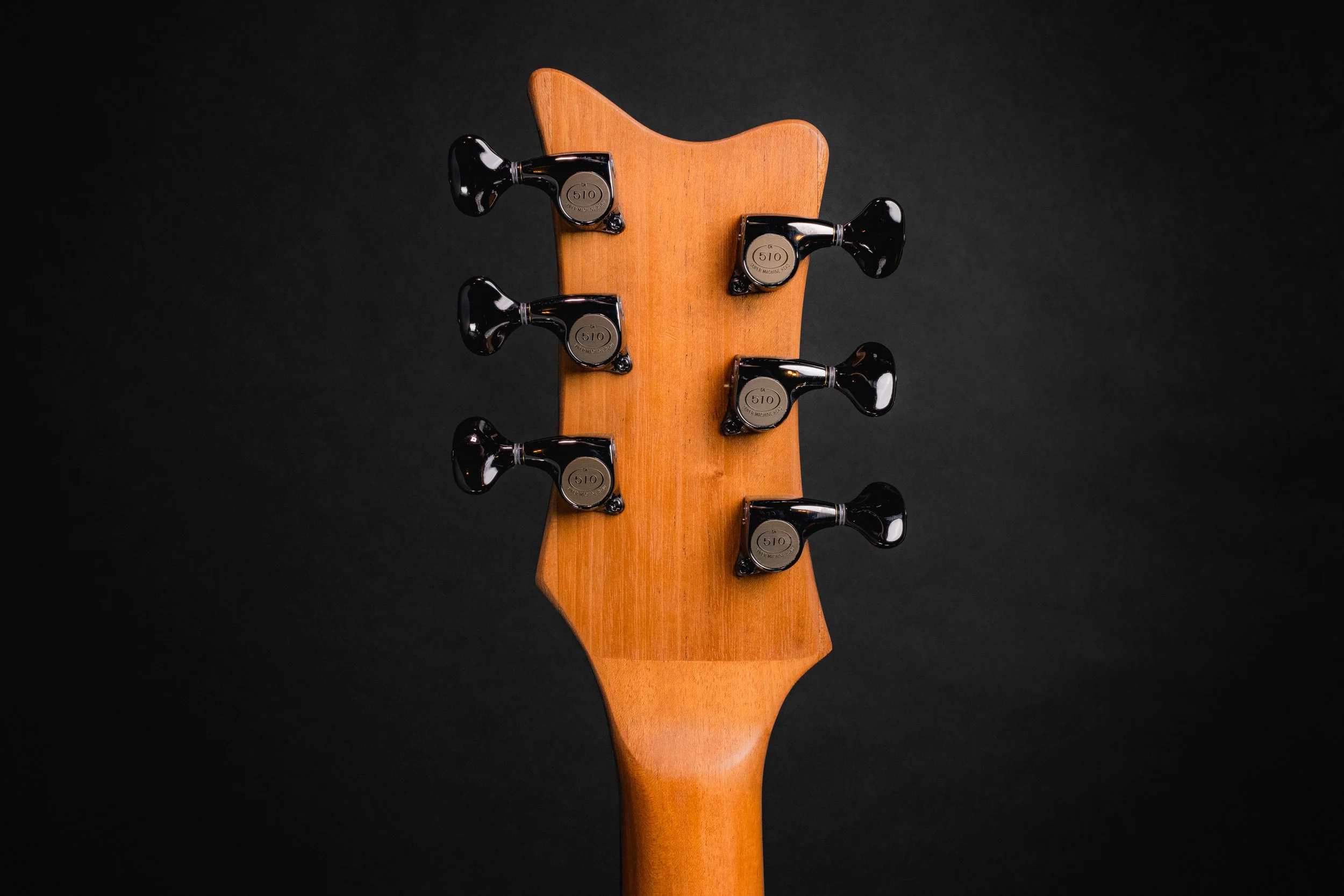 This instrument contains many “firsts.” I had never built with mahogany, used black tuners, or built a mixed-media rosette in this way. This guitar is the heaviest of the batch and sounded like a cannon. It was the favorite of several players, much to the amusement of the buyer!