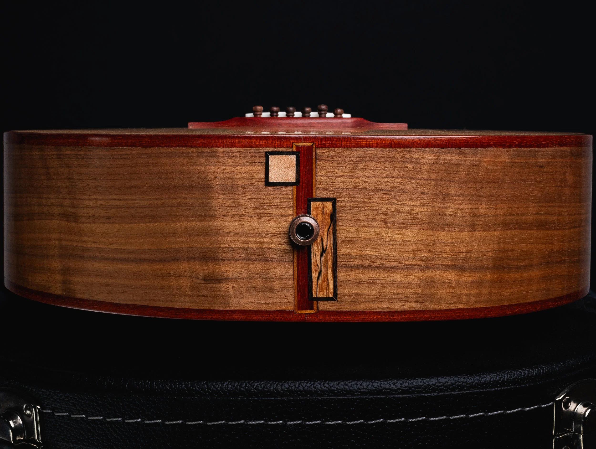 First to feature the Parlor City Package, this guitar features a unique Chaos Headpiece, Tailpiece, Heel, and Rosette. My client was very inspired by Ervin Somogyi, one of my favorite luthiers. I excitedly went to work on a few prototypes of the headpiece before final implementation, and I am glad to announce that this aesthetic will now be available for future orders in the form of the Chaos Package. Furthermore, the client loved the look of Bloodwood accents.