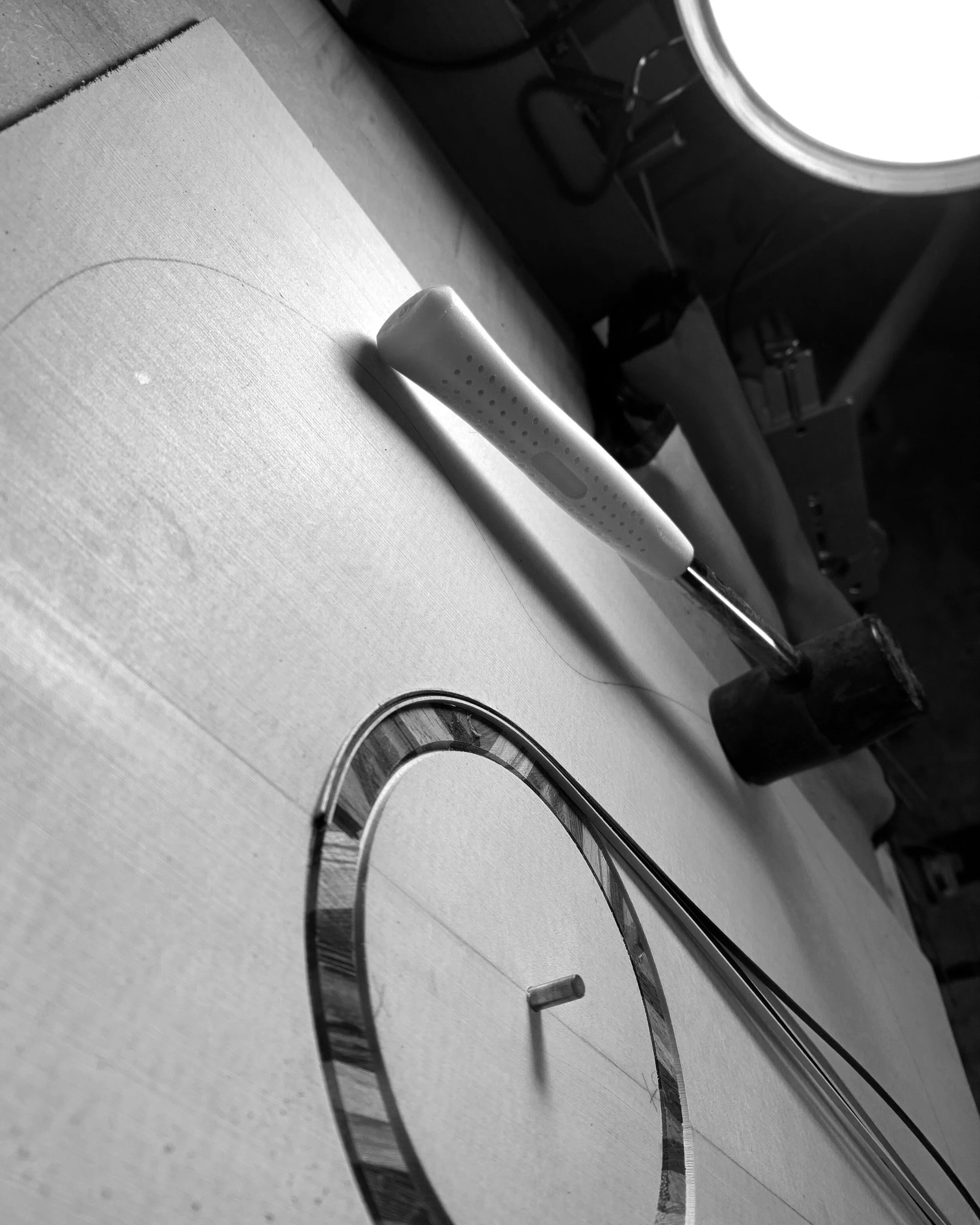 After one afternoon watching him sand a radius onto a set of guitar rims, he explained to me the domed geometry of the steel stringed acoustic guitar, a measurement I never knew existed before. I was amazed. If memory serves, it was right there when I blurted out, “can you teach me how to build a guitar?” He answered after an uncharacteristic hesitation, “let me put some serious thought into this.” (After a few thousand hours of blood, sweat, and tears - and the thinning out of my wallet - I now understand that slight hesitation; he was considering protecting me from from this addictive disease)!